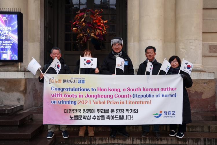 Áö³ 8ÀÏ ½º¿þµ§ ½ºÅåȦ¸§¿¡ µµÂøÇÑ ÃàÇÏ»çÀý´ÜÀº ³ëº§¹Ú¹°°ü ¾Õ¿¡¼ ÇѰ ÀÛ°¡ÀÇ ³ëº§¹®Çлó ¼ö»óÀ» ÃàÇÏÇÏ´Â Ç÷¡Ä«µå¸¦ °É¾î ÇöÁö ½Ã¹ÎµéÀÇ °ü½ÉÀ» ¹Þ¾Ò´Ù.