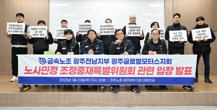 ±Ý¼Ó³ëÁ¶ ±¤ÁÖÀü³²ÁöºÎ ±Û·Î¹ú¸ðÅͽºÁöȸ(³ëÁ¶)´Â 23ÀÏ ±¤ÁÖ ±¤»ê±¸ ¹ÎÁÖ³ëÃÑ ±¤ÁÖº»ºÎ 5Ãþ ´ëȸÀǽǿ¡¼ ±âÀÚȸ°ßÀ» ¿¾î ¡°¿À´Â 24ÀÏ Á¶Á¤À§ÀÇ ´ç»çÀÚ ÀÇ°ß Ã»Ãë ÀÚ¸®¿¡ Âü¼®Çϰڴ١±¸ç À̰°ÀÌ ¹àÇû´Ù.