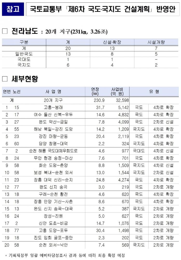 23ÀÏ Àü³²µµ¿¡ µû¸£¸é µµ·Î ºÐ¾ß ±¹°¡°èȹÀÎ ¡®Á¦6Â÷ ±¹µµ¡¤±¹Áöµµ °Ç¼³°èȹ¡¯ ±¹Åä±³ÅëºÎ¾È¿¡ Àü³² ÇÙ½É »ç¾÷ 20°Ç, 3Á¶3000¾ï ¿ø ±Ô¸ðÀÇ »ç¾÷ÀÌ ¹Ý¿µµÆ´Ù.