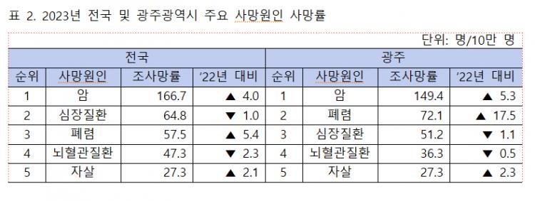 3ÀÏ ±¤Áֽà °ø°øº¸°ÇÀÇ·áÁö¿ø´ÜÀÌ ¹ß°£ÇÑ ¡®2024 ±¤ÁֽùÎÀÇ ¿ÃÇØÀÇ °Ç°¡¯ º¸°í¼¿¡ µû¸£¸é 2023³â ±¤Áֽà Àα¸ 10¸¸¸í ´ç ½Å±Ô »ç¸ÁÀÚ ºñÀ²(Á¶»ç¸Á·ü)Àº 624.1¸íÀ¸·Î ³ªÅ¸³µ´Ù. ÇÑ ÇØ Àüº¸´Ù 4.5%(29.2¸í) °¨¼ÒÇÑ ¼öÄ¡´Ù.