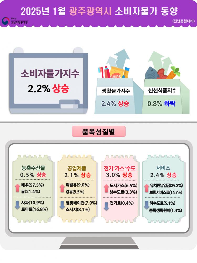 5ÀÏ È£³²Áö¹æÅë°èûÀÌ ¹ßÇ¥ÇÑ ¡®1¿ù ±¤ÁÖ¡¤Àü³² ¼ÒºñÀÚ¹°°¡ µ¿Ç⡯¿¡ µû¸£¸é ±¤ÁÖ ¼ÒºñÀÚ ¹°°¡Áö¼ö´Â 115.94(2020³â=100)·Î Àü³âµ¿¿ù´ëºñ 2.2% »ó½ÂÇØ Àü¿ù 2.0%º¸´Ù 0.2%Æ÷ÀÎÆ®(p) ¿Ã¶ú´Ù.