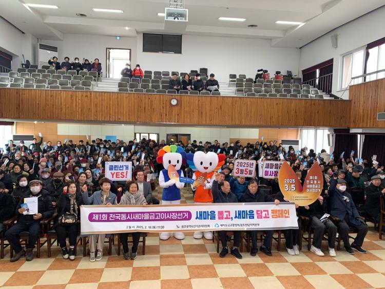 ±¤Áֽü±°Å°ü¸®À§¿øÈ¸(ÀÌÇÏ¡®±¤Áֽü±°üÀ§¡¯)´Â ¿À´Â 3¿ù 5ÀÏ Á¦1ȸ Àü±¹µ¿½Ã»õ¸¶À»±Ý°íÀÌ»çÀå¼±°Å¿Í °ü·ÃÇÏ¿© ¼¹æ»õ¸¶À»±Ý°í ȸ¿ø 300¸íÀ» ´ë»óÀ¸·Î Áö³ 15ÀÏ ºÏ±¸ ¼ÒÀç ¾Èº¸È¸°ü¿¡¼ °ø¸í¼±°Å ´ÙÁü Ä·ÆäÀÎÀ» ½Ç½ÃÇß´Ù. À̳¯ Çà»ç´Â Çà¿îÀ» °¡Á®´ÙÁشٴ Æ÷ÃáÄíŰ »Ì±â¿Í °ø¸í¼±°Å ´ÙÁü À̺¥Æ®µµ ÇÔ²² ÁøÇàµÇ¾î, »õ¸¶À»±Ý°í¼±°Å ÅõÇ¥Âü¿©·Î »õ¸¶À»±Ý°í¿Í ¿ì¸® Áö¿ª¿¡ Çà¿îÀ» ´ã´Â´Ù´Â Àǹ̷Ρ®»õ¸¶À» »Ì°í, »õ¸¶À½ ´ã°í¡¯¶ó´Â ÁÖÁ¦·Î ÁøÇàµÆ´Ù. ±¤Áֽü±°üÀ§ °ü°èÀÚ´Â ¡°¿ì¸®À§¿øÈ¸¿¡¼ óÀ½ À§Å¹ ¹Þ¾Æ ½Ç½ÃÇÏ´Â ¼±°ÅÀθ¸Å °ø¸í¼±°Å ºÐÀ§±â Á¶¼ºÀ» À§ÇØ Áö¼ÓÀûÀ¸·Î ³ë·ÂÇϰڴ١±°í ÀüÇß´Ù.