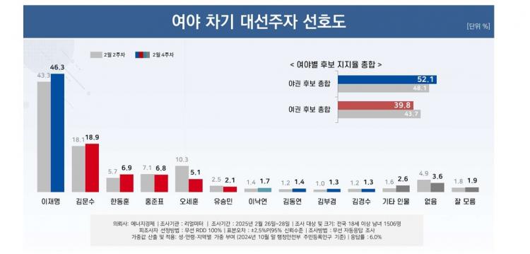 ¿©·ÐÁ¶»ç Àü¹®È¸»ç ¸®¾ó¹ÌÅͰ¡ ¿¡³ÊÁö°æÁ¦½Å¹® ÀÇ·Ú·Î Áö³´Þ 26~28ÀÏ(2¿ù4ÁÖÂ÷) ÀÌÆ²°£ Àü±¹ 18¼¼ ÀÌ»ó À¯±ÇÀÚ 1506¸íÀ» ´ë»óÀ¸·Î ¿©¾ß Â÷±â ´ë¼± Èĺ¸ ¼±È£µµ Á¶»ç¿¡¼ ÀÌÀç¸í ´ëÇ¥°¡ 46.3%, ±è¹®¼ö Àå°üÀÌ 18.9%·Î °¢°¢ 1À§¿Í 2À§¸¦ ±â·ÏÇß´Ù. ÀÌ ´ëÇ¥´Â Áö³ Á¶»ç(2¿ù2ÁÖÂ÷) ´ëºñ 3%Æ÷ÀÎÆ® »ó½ÂÇß°í ±è Àå°üÀº °°Àº ±â°£ 0.8%Æ÷ÀÎÆ® ¿Ã¶ú´Ù.