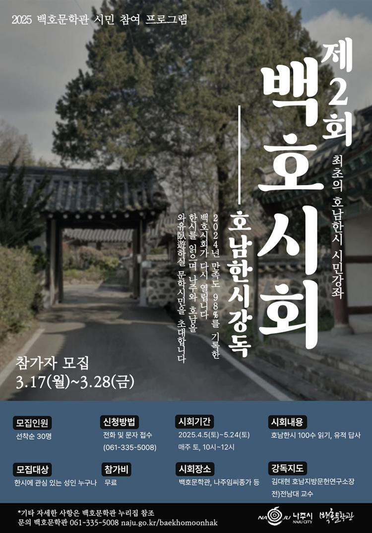 ¹éÈ£½Ãȸ Çѽÿ¡ °ü½ÉÀÌ ÀÖ´Â ¼ºÀÎ ´©±¸³ª ½ÅûÇÒ ¼ö ÀÖÀ¸¸ç Âü°¡ºñ´Â ¹«·á´Ù. ¿À´Â 3¿ù 28ÀϱîÁö ¹éÈ£¹®Çаü ´ëÇ¥ ÀüÈ·Î ½ÅûÇÏ¸é µÈ´Ù.