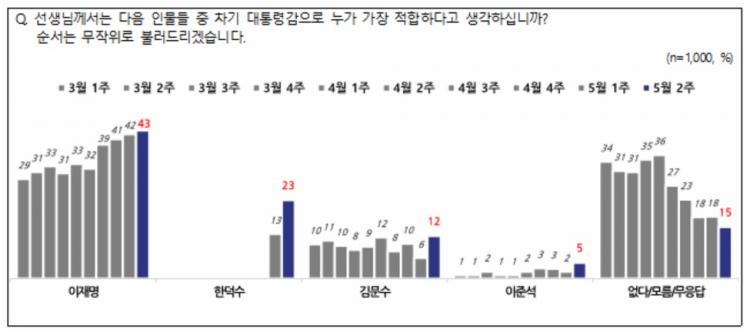 ¿¥ºê·¹ÀÎÆÛºí¸¯¡¤ÄÉÀ̽ºÅȸ®¼Ä¡¡¤ÄÚ¸®¾Æ¸®¼Ä¡¡¤Çѱ¹¸®¼Ä¡°¡ Áö³ 5~7ÀÏ ¸¸ 18¼¼ ÀÌ»ó 1000¸íÀ» ´ë»óÀ¸·Î Á¶»çÇØ ¹ßÇ¥ÇÑ Àü±¹ÁöÇ¥Á¶»ç(NBS)¸¦ º¸¸é ¡®Â÷±â ´ëÅë·É°¨À¸·Î ´©°¡ °¡Àå ÀûÇÕÇÏ´Ù°í »ý°¢ÇÏ´À³Ä¡¯´Â Áú¹®¿¡ ÀÀ´äÀÚ 43%°¡ ÀÌÀç¸í Àü ´ëÇ¥¶ó°í ´äÇß´Ù. Áö³ÁÖº¸´Ù 1%Æ÷ÀÎÆ® »ó½ÂÇÑ ¼öÄ¡·Î 3ÁÖ ¿¬¼Ó 40%´ë¸¦ µ¹ÆÄÇß´Ù.