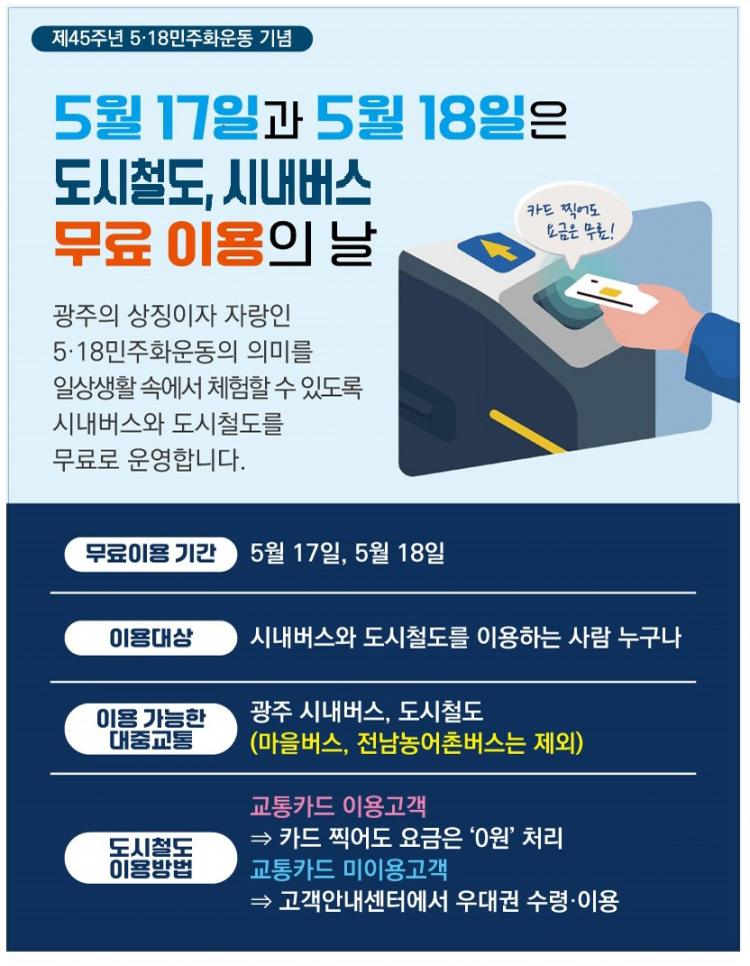 ±¤ÁÖ±³Åë°ø»ç´Â 5¿ù 17Àϰú 18ÀÏ ÀÌÆ² µ¿¾È ±¤ÁÖµµ½Ãöµµ ¹«·á ½ÂÂ÷¸¦ ½Ç½ÃÇÑ´Ù°í 11ÀÏ ¹àÇû´Ù. ÀÌ ±â°£ µ¿¾È ±¤ÁÖµµ½Ãöµµ °³Âû±¸¿¡ ±³ÅëÄ«µå¸¦ Âï¾îµµµµ ¿ä±ÝÀº ¡®0¿ø¡¯ 󸮵ȴÙ. ±³ÅëÄ«µå¸¦ ÀÌ¿ëÇÏÁö ¾Ê´Â ½Â°´Àº °¢ ¿ª °í°´¾È³»¼¾ÅÍ¿¡¼ ¿ì´ë±ÇÀ» ¹Þ¾Æ ¹«·á·Î ž½ÂÇÒ ¼ö ÀÖ´Ù.