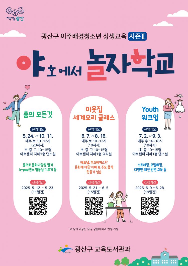 À̹ø ÇÁ·Î±×·¥Àº 2025³â ±¤»ê±¸ ÀÌÁÖ¹è°æÃ»¼Ò³â »ó»ý±³À°ÀÇ Çϳª·Î ´Ù¾çÇÑ ÀÌÁÖ¹è°æ °¡Á¤ÀÌ ¹ÐÁýÇØ Àִ Ư¼ºÀ» ¹Ý¿µÇØ Ã»¼Ò³âµéÀÌ ¹®ÈÀÇ ´Ù¾ç¼ºÀ» ÀÌÇØÇÏ°í ¶Ç·¡¿Í ±³·ùÇϸç Á¤¼Àû ¾ÈÁ¤°ú »çȸÀû °ü°è¸¦ Çü¼ºÇÒ ¼ö ÀÖµµ·Ï ¸¶·ÃµÆ´Ù.