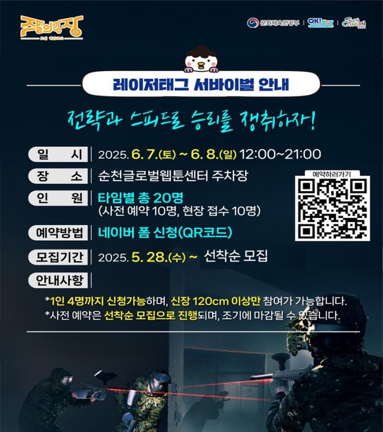 ·¹ÀÌÀú ű×(Laser Tag)¶õ ºñÁ¢ÃËÇü ÀüÀÚ »ç°Ý ½ºÆ÷Ã÷·Î, ÃÑ¾Ë ´ë½Å Àû¿Ü¼± ·¹ÀÌÀú¸¦ »ç¿ëÇÏ´Â ¼¹ÙÀ̹ú °ÔÀÓÀÌ´Ù. ¡®Â÷ ¾ø´Â °Å¸®¡¯¿¡¼ ÆîÃÄÁö´Â ÄÜÅÙÃ÷ ÃàÁ¦ÀÎ ¸¸Å, ±Û·Î¹úÀ¥Å÷¼¾ÅÍ ÁÖÂ÷Àå(½Ã¹Î°ø¿µÁÖÂ÷Àå)À» Ȱ¿ëÇÏ¿© Çà»ç ±â°£ »ó¼³ ÇÁ·Î±×·¥À¸·Î ¿î¿µµÉ ¿¹Á¤ÀÌ´Ù. ÇÑ Å¸ÀÓº° ÃÑ 20¸í±îÁö Âü¿©ÇÏ¿© 30ºÐ°£ üÇèÀÌ ÁøÇàµÇ¸ç, ¿ÀÈÄ 12½ÃºÎÅÍ 21½Ã±îÁö ¸Å½Ã°£ Á¤°¢°ú 30ºÐ¿¡ °ÔÀÓÀÌ ½ÃÀ۵ȴÙ. ½ÅÀå 120cm ÀÌ»ó¸¸ Âü¿©°¡ °¡´ÉÇϰí, Âü¿©ÀÚ´Â ¾ÈÀüÀåºñ¸¦ Âø¿ëÇÏ¿©¾ß ÇÑ´Ù. ¿øÈ°ÇÑ Çà»ç ¿î¿µÀ» À§ÇØ Å¸ÀÓº° Âü¿©ÀÚ´Â »çÀü ¿¹¾à°ú ÇöÀå Á¢¼ö·Î ÀοøÀ» 10¸í¾¿ ³ª´©¾î ¸ðÁýµÈ´Ù. »çÀü ¿¹¾àÀº Æ÷½ºÅÍÀÇ QRÄÚµå ½ºÄµÀ» ÅëÇØ ¼±Âø¼ø Á¢¼ö·Î ÀÌ·ç¾îÁö¸ç, ÇöÀå Á¢¼ö·Îµµ Âü¿©ÇÒ ¼ö ÀÖ´Ù.