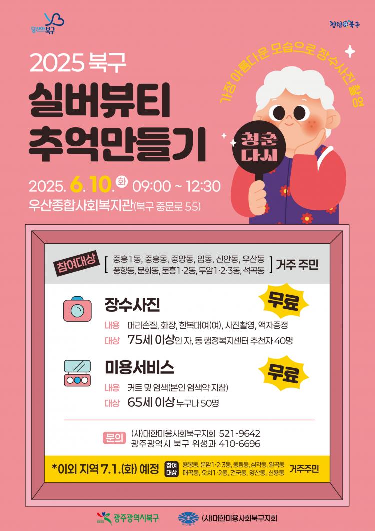 ¶ÇÇÑ ¡®Àå¼ö»çÁø ÃÔ¿µ¡¯Àº µ¿ ÇàÁ¤º¹Áö¼¾ÅÍ¿¡¼ »çÀü¿¡ ÃßõÇÑ ¸¸ 75¼¼ ÀÌ»ó ¾î¸£½Å 80¸íÀ» ´ë»óÀ¸·Î ¡ãÇì¾î(ĿƮ ¹× µå¶óÀÌ) ¡ã¸ÞÀÌÅ©¾÷ ¡ãÇѺ¹ ´ë¿© ¡ãÀå¼ö »çÁø ÃÔ¿µ ¡ã¾×ÀÚ Á¦ÀÛ µî Àü °úÁ¤À» Áö¿øÇÏ¿© ¾î¸£½ÅµéÀÇ Àå¼ö»çÁø ÃÔ¿µ °æÇèÀÌ ¼ÒÁßÇÑ Ãß¾ïÀ¸·Î ³²À» ¼ö ÀÖµµ·Ï µ½´Â´Ù.