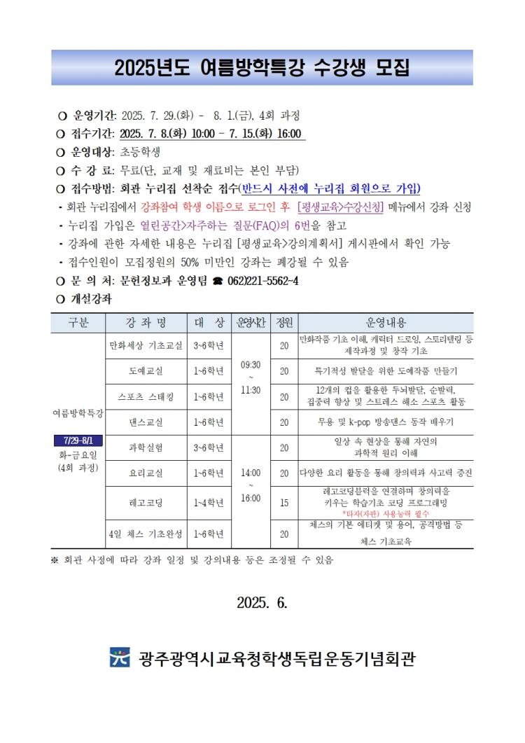 ¿©¸§¹æÇРƯ°Àº ¿À´Â 29ÀϺÎÅÍ 8¿ù 1ÀϱîÁö 4Àϰ£ ÁøÇàµÈ´Ù. ÀÌ ±â°£ ¡ã¸¸È¼¼»ó ±âÃʱ³½Ç ¡ãµµ¿¹±³½Ç ¡ã½ºÆ÷Ã÷ ½ºÅÂÅ· ¡ã´í½º±³½Ç ¡ã°úÇнÇÇè ¡ã¿ä¸®±³½Ç ¡ã·¹°íÄÚµù ¡ã4ÀÏ Ã¼½º ±âÃʱ³½Ç µî 8°³ °Á°¡ ÁøÇàµÇ¸ç, ¼ö°·á´Â ¹«·á´Ù. ´Ü, ±³Àç ¹× Àç·áºñ´Â ¼ö°»ýÀÌ ºÎ´ãÇØ¾ß ÇÑ´Ù.
