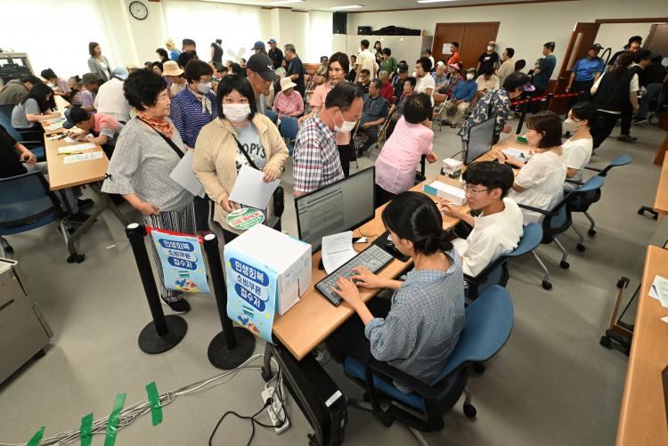Àü´ã ⱸ°¡ Â÷·ÁÁø ¼¾ÅÍ 2Ãþ±îÁö ÁֹΠ300¿©¸íÀÌ ¸¸µç ÁÙÀÌ ´Ã¾î¼± »óȲ. ¾î¸£½Å°ú ºó°ïÃþÀÌ ¸¹ÀÌ »ç´Â ÀÏ´ëÀÎ ¸¸Å ÁÙÀ» ¼± ÁֹεéÀÇ Ç¥Á¤¿¡´Â Àú¸¶´Ù °£ÀýÇÔ°ú ¾Ö´ÞÇÄÀÌ ¹¯¾î ³ª¿Ô´Ù.