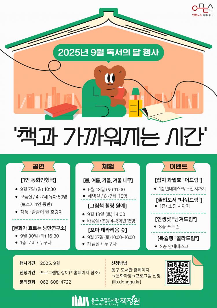 9¿ù 27ÀÏ¿¡´Â ±¤Áֽø³µµ¼°ü°ú ¿¬°èÇÑ ¡®µµ¼°ü¡¤ìÑ¡¤BOOK¡¯ »ç¾÷À» ÅëÇØ ¡®¿ë±â·Îº¿ÀÇ ºñ¹Ð¡¯À» ¾´ ÀÌ¿íÀç ÀÛ°¡ÀÇ °¿¬°ú °ø¿¬À» ¼±º¸À̸ç, ¡®¸¶À½°ú ¸¶À½ÀÌ ÁÖ°í¹Þ´Â ¸»¡¯À» ¾´ ¹é¾Ö¼Û ÀÛ°¡ÀÇ °¿¬, Ãʷϼú»ç ÀÌÇü¿ì ¸¶¼ú»ç °ø¿¬ µîÀÌ ¿¹Á¤µÇ¾î ÀÖ¾î ´Ù¾çÇÑ º¼°Å¸®¸¦ Á¦°øÇÑ´Ù.