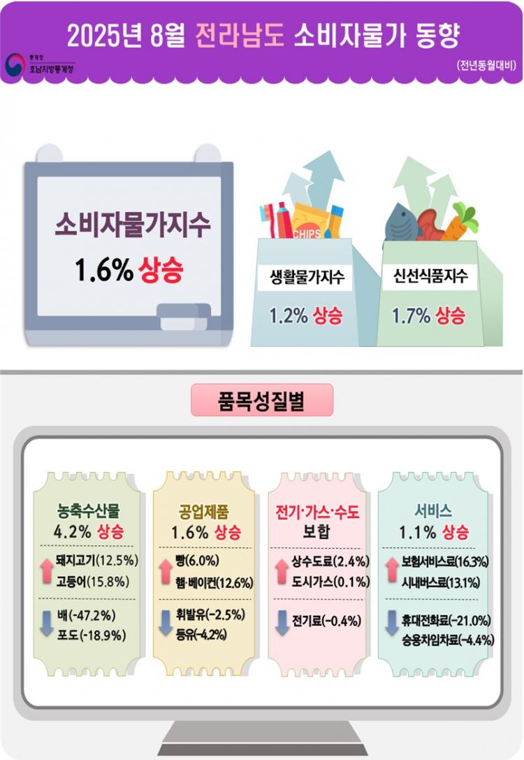 2ÀÏ È£³²Åë°èûÀÇ 8¿ù ±¤ÁÖÀü³² ¼ÒºñÀÚ¹°°¡µ¿Çâ¿¡ µû¸£¸é 8¿ù ±¤ÁÖ ¼ÒºñÀÚ¹°°¡Áö¼ö´Â 116.56(2020³â=100)À¸·Î Áö³ÇØ °°Àº´Þ¿¡ ºñÇØ 1.4% »ó½ÂÇß´Ù. Áö³´Þ(1.7%)¿¡ ºñÇØ 0.3%Æ÷ÀÎÆ® Ç϶ôÇß´Ù.