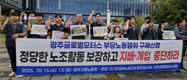 ±Ý¼Ó³ëÁ¶ ±¤ÁÖÀü³²ÁöºÎ¿Í GGM Áöȸ´Â 15ÀÏ ±¤ÁÖ ºÏ±¸ °í¿ë³ëµ¿Ã» ¾Õ¿¡¼ ±âÀÚȸ°ßÀ» ¿°í ¡°»çÃø °æ¿µÁøÀÇ ¹Ýº¹ÀûÀÎ ³ëÁ¶ ºñ¹æ°ú Á¶ÇÕ È°µ¿ ¹æÇØ µî ÀÏ·ÃÀÇ Áö¹è¡¤°³ÀÔ ºÎ´ç³ëµ¿ÇàÀ§¿¡ ´ëÇØ Àü³²Áö³ëÀ§¿¡ ±¸Á¦½ÅûÀ» Á¢¼öÇß´Ù¡±°í ¹àÇû´Ù.