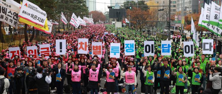 À̳¯ Âü°¡ÀÚµéÀº ¡®Â÷º°À» ³¡³»ÀÚ¡¯ ¡®Áý´ÜÀӱݱ³¼· ½Â¸®¡¯ ¡®ÀúÀÓ±ÝÂ÷º°, ÅõÀïÀÌ ´äÀÌ´Ù¡¯ ¼ÕÇÇÄÏÀ» µé°í ±¹È¸ ¾Õ¿¡ ¸ð¿´´Ù. ÁÖÃÖ Ãø Ãß»ê 4000~5000¸í °¡·®ÀÇ Çб³ ºñÁ¤±ÔÁ÷ ³ëµ¿ÀÚµéÀÌ Âü°¡Çß´Ù.
