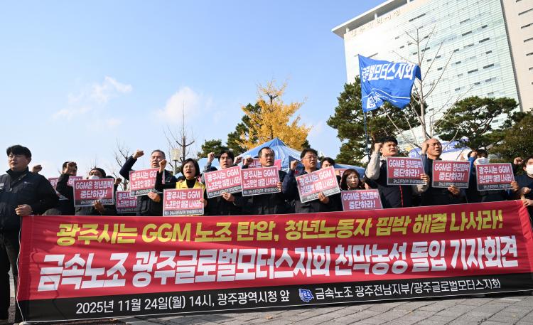 Àü±¹±Ý¼Ó³ëµ¿Á¶ÇÕ ±¤ÁÖÀü³²ÁöºÎ¿Í GGM Áöȸ´Â 24ÀÏ ¿ÀÈÄ ±¤ÁÖ ¼±¸ ±¤ÁÖ½Ãû ¾Õ¿¡¼ ±âÀÚȸ°ßÀ» ¿°í ¡°³ëÁ¶ Ȱµ¿À» ÀÌÀ¯·Î ¡°è¡¤Â÷º°¡¤Æø·Â¡¤Çù¹ÚÀ» ¹Ýº¹Çϸç û³â ³ëµ¿ÀÚ¸¦ Áþ´©¸£´Â »çÃø °æ¿µÀ» ±¤Áֽð¡ Ã¥ÀÓÁ®¾ß ÇÑ´Ù¡±°í ¹àÇû´Ù.