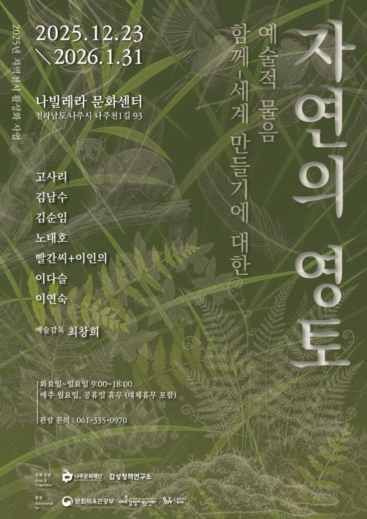 ³ªÁÖ¹®ÈÀç´Ü(ÀÌ»çÀå À±º´ÅÂ)¿¡ µû¸£¸é ¹®ÈüÀ°°ü±¤ºÎ¿Í ¿¹¼ú°æ¿µÁö¿ø¼¾ÅͰ¡ ÁÖ°üÇÑ ¡®2025³â Áö¿ªÀü½Ã Ȱ¼ºÈ »ç¾÷ À¯Çü3 ¹Ì¼úÄÜÅÙÃ÷-Àü½Ã°ø°£ ¸ÅĪ Áö¿ø¡¯ °ø¸ð¿¡ ¼±Á¤µÅ Àü½Ã ¡®ÀÚ¿¬ÀÇ ¿µÅä ÇÔ²²-¼¼°è¸¸µé±â¿¡ ´ëÇÑ ¿¹¼úÀû ¹°À½¡¯À» 12¿ù 23ÀϺÎÅÍ 2026³â 1¿ù 31ÀϱîÁö ³ªºô·¹¶ó¹®È¼¾ÅÍ¿¡¼ °³ÃÖÇÑ´Ù.