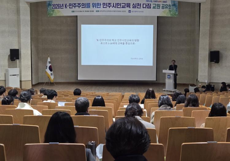 ½Ã±³À°Ã»Àº 26ÀÏ ±¤ÁֽùÎÇùÄ¡ÁøÈï¿ø ´ë°´ç¿¡¼ ÃÊ¡¤Áß¡¤°í¡¤Æ¯¼öÇб³ ¹ÎÁֽùα³À° ´ã´ç ±³¿ø 200¿© ¸íÀ» ´ë»óÀ¸·Î ¡®2026³â K-¹ÎÁÖÁÖÀǸ¦ À§ÇÑ ¹ÎÁֽùα³À° ½Çõ ´ÙÁü ±³¿ø °øÀ¯È¸¡¯¸¦ ¿°í ÀÌ·¯ÇÑ ³»¿ëÀ» ¾È³»Çß´Ù.