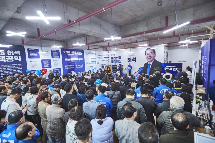 Çã¼® ¼øÃµ½ÃÀå ¿¹ºñÈ帴 12ÀÏ ¿ÀÈÄ 3½Ã ¼±°ÅÄ·ÇÁ ¡®¼øÃµÀÇ º½¡¯°³¼Ò½ÄÀ» °³ÃÖÇϰí 800¿©¸íÀÇ ÁöÁöÀÚ¿Í ½Ã¹ÎµéÀÌ Âü¼®ÇÑ °¡¿îµ¥ Ä·ÇÁ Ãâ¹üÀ» °ø½ÄÈÇß´Ù. ÆòÀÏ ¿ÀÈÄ ½Ã°£´ëÀÓ¿¡µµ ºÒ±¸Çϰí Çà»çÀå¿¡´Â ½Ã¹Î°ú ´ç¿øµéÀÌ ¸ð¿© ÀλêÀÎÇØ°¡ µÇ¾î ¼øÃµÀÇ ¹Ì·¡¿Í Áö¿ª ¹ßÀü ¹æÇâ¿¡ ´ëÇÑ ³ôÀº °ü½ÉÀ» º¸¿´´Ù.