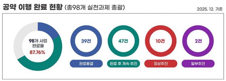 2025³â 12¿ù ¸» ±âÁØ ³ªÁֽô ÃÑ 98°³ °ø¾à »ç¾÷ Áß 86°³¸¦ ¿Ï·áÇϰųª ÀÌÇà ÈÄ ÃßÁøÇØ 87.76%ÀÇ ÀÌÇà·üÀ» ±â·ÏÇßÀ¸¸ç ÀÌ´Â Àü±¹ Æò±Õ 70.42%º¸´Ù 17.34%p, Àü³² Æò±Õ 68.27%º¸´Ùµµ Å©°Ô ³ôÀº ¼öÄ¡´Ù.