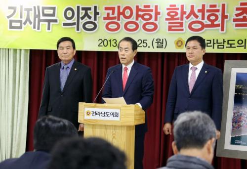 Àü³²µµÀÇȸ ±èÀ繫 ÀÇÀå(°¡¿îµ¥)ÀÌ 25ÀÏ µµÀÇȸ ºê¸®Çη뿡¼ Á¤ºÎÀÇ À߸øµÈ Ç׸¸Á¤Ã¥°ú ±¤¾çÇ× ¿¹»ê Ȧ´ë¸¦ ºñÆÇÇÏ¸ç ±¤¾çÇ× È°¼ºÈ¸¦ À§ÇØ Á¤ºÎ Â÷¿øÀÇ È¹±âÀûÀÎ Áö¿øÃ¥ ¸¶·ÃÀ» Ã˱¸Çϰí ÀÖ´Ù. ¿ÞÂÊÀº ¼ÕÅ¿, ¿À¸¥ÂÊÀº ÀÌ¿ëÀç ÀÇ¿ø.