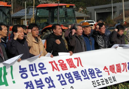 Áøµµ±º ³ó¹Îȸ °û±æ¼º ȸÀåÀº ¡°°¡°ÝºÒ¾ÈÁ¤¿¡ µû¸¥ »êÁöÆó±â°¡ 2³â¿¡ Çѹø ²Ã·Î ÀÌ·ïÁö°í ÀÖÀ¸³ª 2008³â ÀÌÈÄ Á¤ºÎÀÇ ¼ö¸ÅÀÚ±ÝÀÌ ÅõÀÔµÇÁö ¾Ê°í ÀÖ´Ù¡±¸é¼ ¡°³ó¾È±â±Ý 32¾ï¿øÀ» ÅõÀÔÇÑ 1¸¸t ¼ö¸Å Æó±â¿Í °Ç´ëÆÄ¿Í ³Ãµ¿ÆÄÀÇ Áï°¢ÀûÀÎ ¼öÀÔÀÇ Áß´ÜÀÌ ÀÌ·ïÁ®¾ß ÇÑ´Ù¡±°í Ã˱¸Çß´Ù.