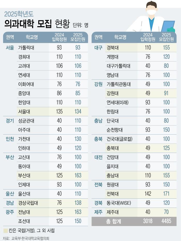 30ÀÏ Çѱ¹´ëÇб³À°ÇùÀÇȸ(´ë±³Çù)°¡ ÃëÇÕÇØ °ø°³ÇÑ 2025Çг⵵ Àǰú´ëÇÐ ´ëÇÐÀÔÇÐÀüÇü ½ÃÇà°èȹ ÁÖ¿ä º¯°æ»çÇ×À» º¸¸é, ÀÇÇÐÀü¹®´ëÇпøÀÎ Â÷Àǰú´ë¸¦ »« ´ëÇÐ 39°³±³´Â ÀÇ´ë ½ÅÀÔ»ý 4485¸í(Á¤¿ø ³»)À» »Ì´Â´Ù.