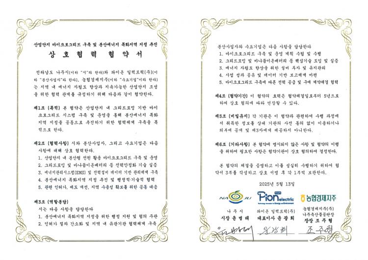 ³ªÁÖ½Ã(½ÃÀå À±º´ÅÂ)´Â ºÐ»ê¿¡³ÊÁö ƯÈÁö¿ª ÁöÁ¤ ¸ñÇ¥¿¡ µû¸¥ ICT ÷´Ü ½Å±â¼úÀ» Àû¿ëÇÑ ¸¶ÀÌÅ©·Î±×¸®µå ±¸Ãà ±â¹Ý Àü·Â°ø±Þ °èȹÀ» ¼ö¸³, Çõ½Å»ê´Ü ÀÔÁÖ±â¾÷ÀÎ ÆÄÀ̿ ÀÏ·ºÆ®¸¯(ÁÖ), ³óÇù°æÁ¦ÁöÁÖ¿Í »óÈ£Çù·Â ¾÷¹«Çù¾àÀ» ü°áÇß´Ù°í 15ÀÏ ¹àÇû´Ù.
