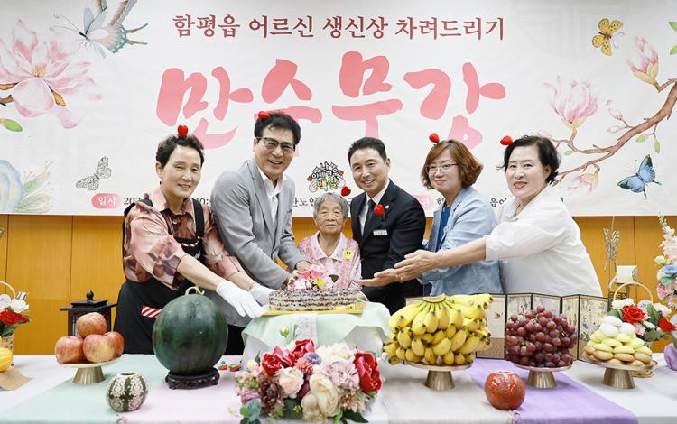 ÇÔÆòÀ¾¿©¼ºÀÚ¿øºÀ»çȸ´Â 70¼¼(°íÈñ), 80¼¼(»ê¼ö), 90¼¼(±¸¼ø), 100¼¼(»ó¼ö)¸¦ ¸ÂÀÌÇÑ È¦·Î »ç½Ã´Â ¾î¸£½Åµé¿¡°Ô µû¶æÇÑ ÇÑ ³¢¸¦ ´ëÁ¢Çϰí ÃàÇϸ¦ µå¸®±â À§ÇØ Çà»ç¸¦ ¸¶·ÃÇß´Ù. ƯÈ÷, ¿ÃÇØ ¹é ¹øÂ° »ý½ÅÀ» ¸ÂÀÌÇϽŠÁ¶º¹ÀÓ ¾î¸£½ÅÀÌ Âü¼®ÇØ Àǹ̸¦ ´õÇß´Ù.