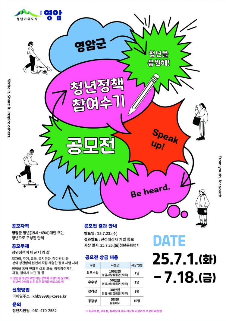 û³âÁ¤Ã¥ Âü¿© ¼ö±â °ø¸ðÀüÀÇ ÀÚ¼¼ÇÑ ³»¿ëÀº ¿µ¾Ï±ºÈ¨ÆäÀÌÁö °í½Ã°ø°í¶õ¿¡¼ º¼ ¼ö ÀÖ°í, ¾È³»´Â ¿µ¾Ï±º Àα¸Ã»³â°ú û³âÁö¿øÆÀ(061-470-2552)¿¡¼ ÇÑ´Ù.
